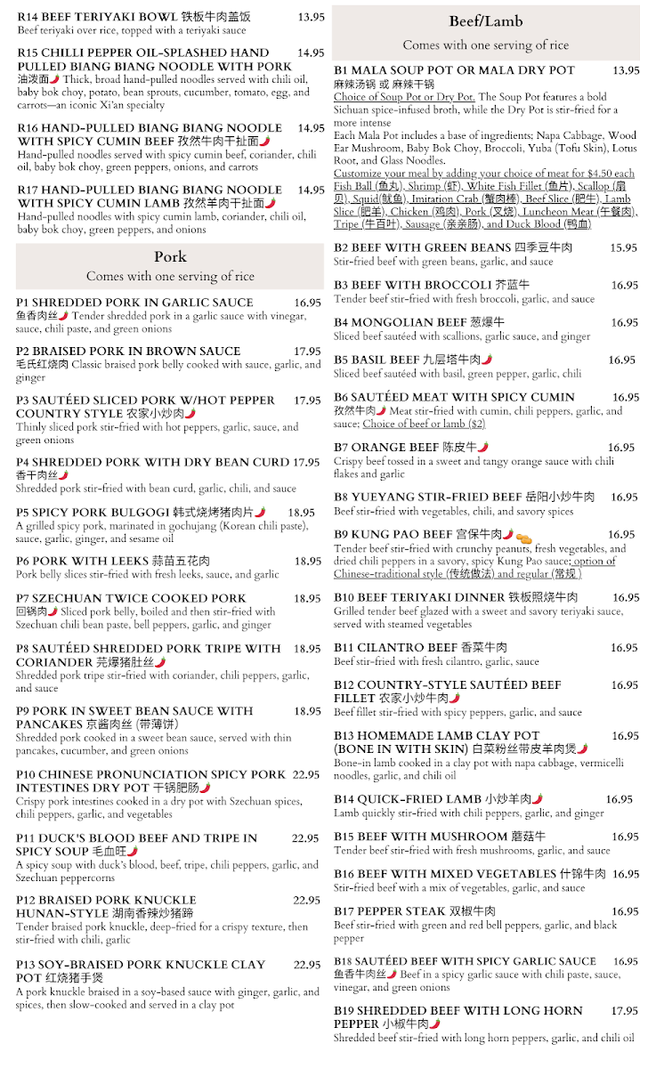 Glass noodle soup in a hot and sour broth with dried lily flower, peanuts, bean sprout, baby bok choy, pickled string beans, green onions, wood ear mushroom and your choice of Beef, Intestine, and Beef combo