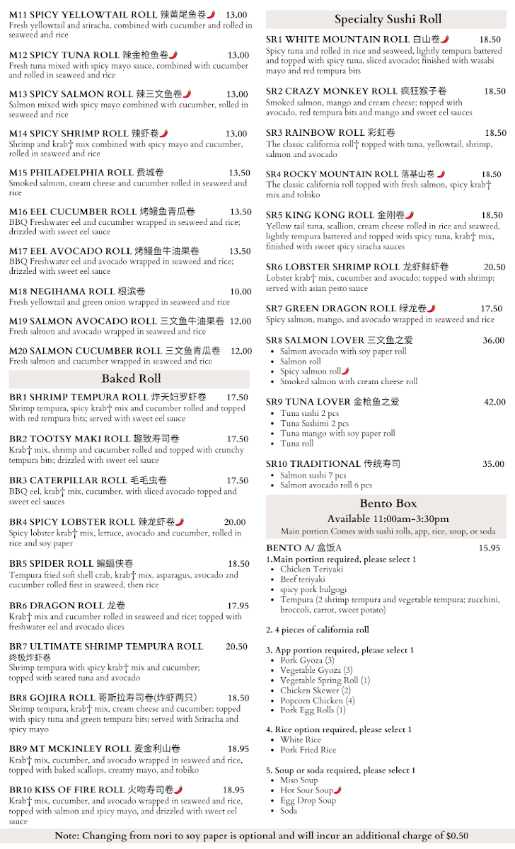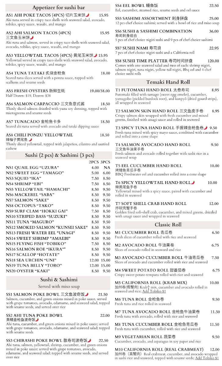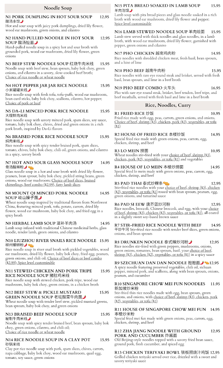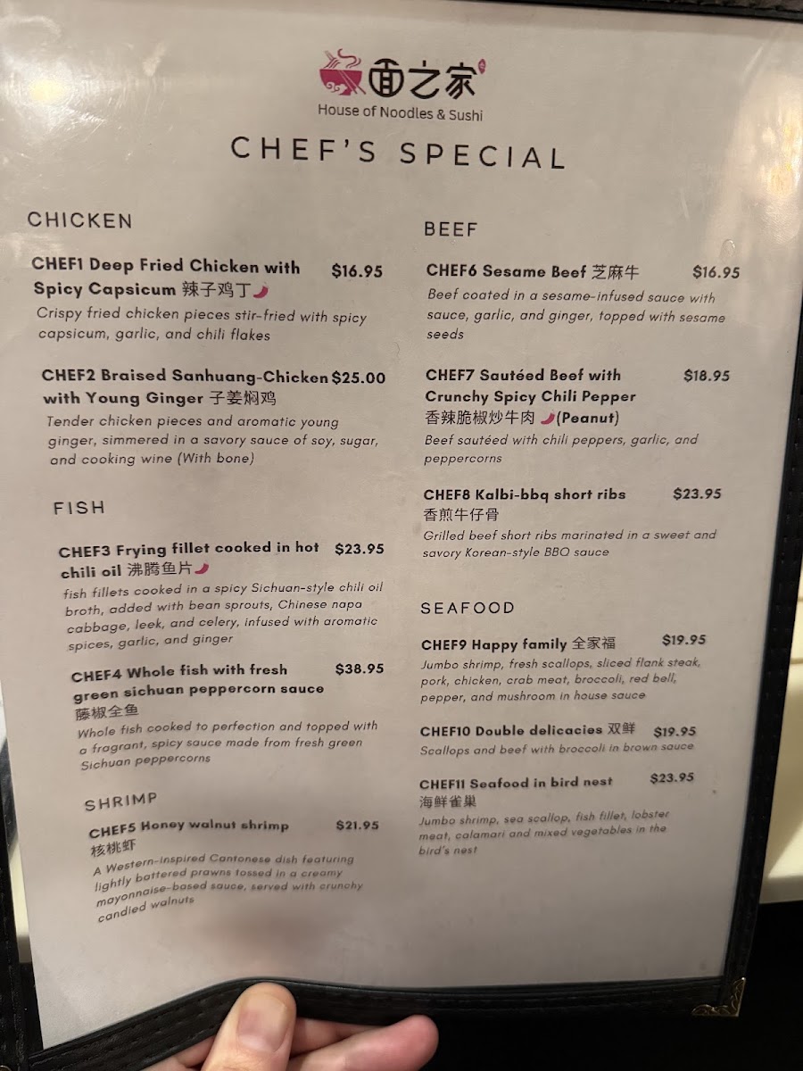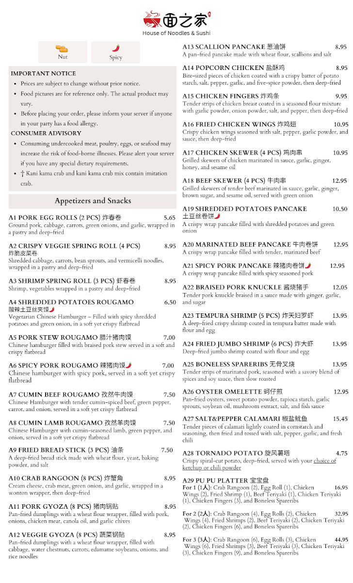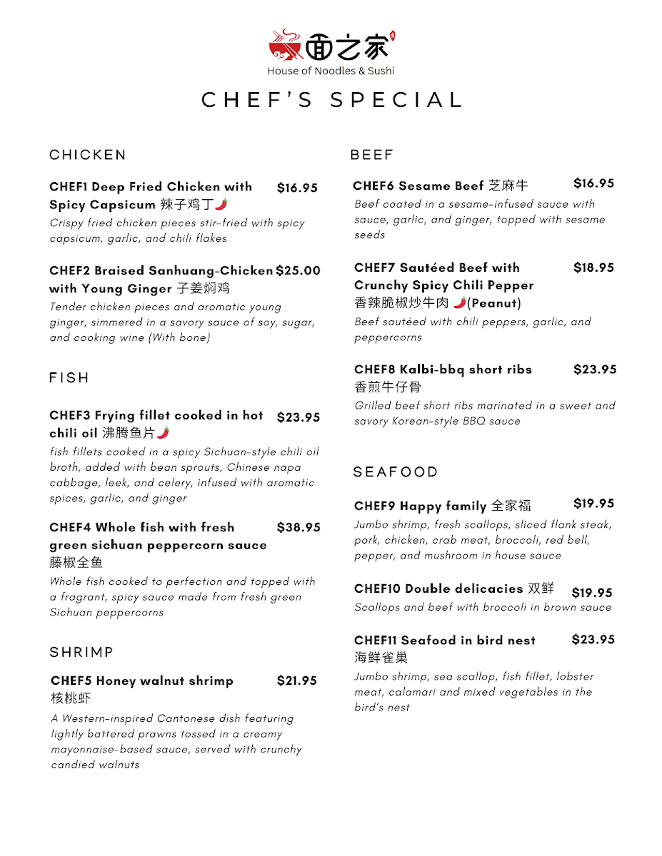 From a reviewer’s perspective, the menu at House Of Noodles And Sushi feels like a confident and well-rounded showcase of Asian cuisine, skillfully blending Chinese comfort food with a strong sushi bar identity. The Chef’s Special section immediately sets the tone with standout dishes such as Chef1 Deep Fried Chicken With Spicy Capsicum, Chef2 Braised Sanhuang-Chicken With Young Ginger, Chef3 Frying Fillet Cooked In Hot Chili Oil, Chef4 Whole Fish With Fresh Green Sichuan Peppercorn Sauce, and Chef5 Honey Walnut Shrimp, highlighting bold flavors and traditional techniques. Starters like A13 Scallion Pancake, A7 Cumin Beef Rougamo, A20 Marinated Beef Pancake, A2 Crispy Veggie Spring Roll (4pcs), and A11 Pork Gyoza (8pcs) provide a satisfying opening, while heartier options shine in the Rice, Noodles & Curry section with dishes such as R12 Zha Jiang Noodle With Ground Pork And Cucumber, R2 House Of Fried Rice, R14 Beef Teriyaki Bowl, R9 Szechuan Dan Dan Noodle (Spicy/Nut), and R15 Chilli Pepper Oil-Splashed Hand Pulled Biang Biang Noodle With Pork (Spicy).