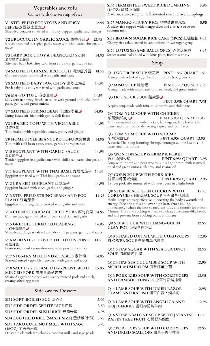 Sushi lovers are equally well catered for, from Baked Rolls like Br1 Shrimp Tempura Roll and Br4 Spicy Lobster Roll (Spicy) to Specialty Sushi Rolls including Sr3 Rainbow Roll and Sr5 King Kong Roll (Spicy), alongside simple Classic Rolls such as M5 California Roll (Krab Mix). The menu further expands with comforting Noodle Soups like N13 Braised Beef Noodles Soup (Spicy), classic Soups such as Q3 Hot Sour Soup (Spicy), and generous platters like Ss8 Sushi Time Platter. Categories for Vegetables And Tofu, Pork, Beef / Lamb, Chicken, Seafood, Dimsum, and Cold Dishes ensure variety for every palate, while finishing touches like Sd11 Red Carrot Cake With Egg Custard (4 Pcs) and refreshing drinks from hot tea to soda round out the experience. Overall, the menu feels extensive yet thoughtfully curated, making House Of Noodles And Sushi a reliable destination for both adventurous diners and those craving familiar favorites.